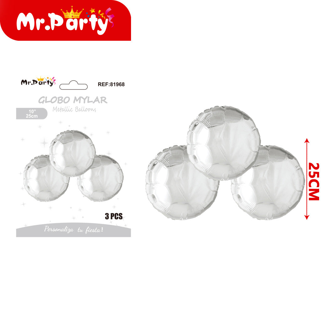 Bola redonda plateada de 3 piezas de 10 pulgadas. Ideal para complementar la decoración y darle un toque especial al evento. Se venden en paquetes de máximo 12 unidades.