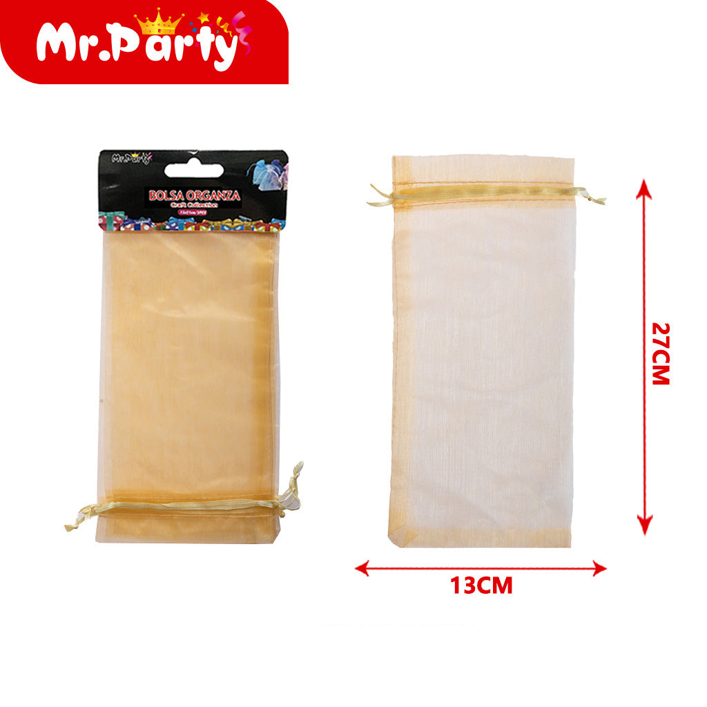 Bolsa de hilo de 13 x 27 cm 3 piezas color dorado. Ideal para complementar la decoración y darle un toque especial al evento. Se venden en paquetes de máximo 12 unidades.