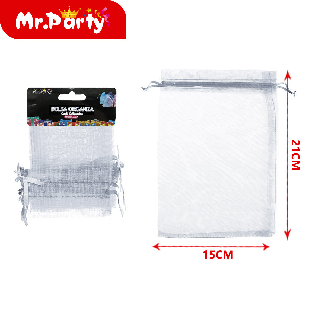 Bolsa de hilo de 15 x 21 cm 3 piezas color plateado. Ideal para complementar la decoración y darle un toque especial al evento. Se venden en paquetes de máximo 12 unidades.