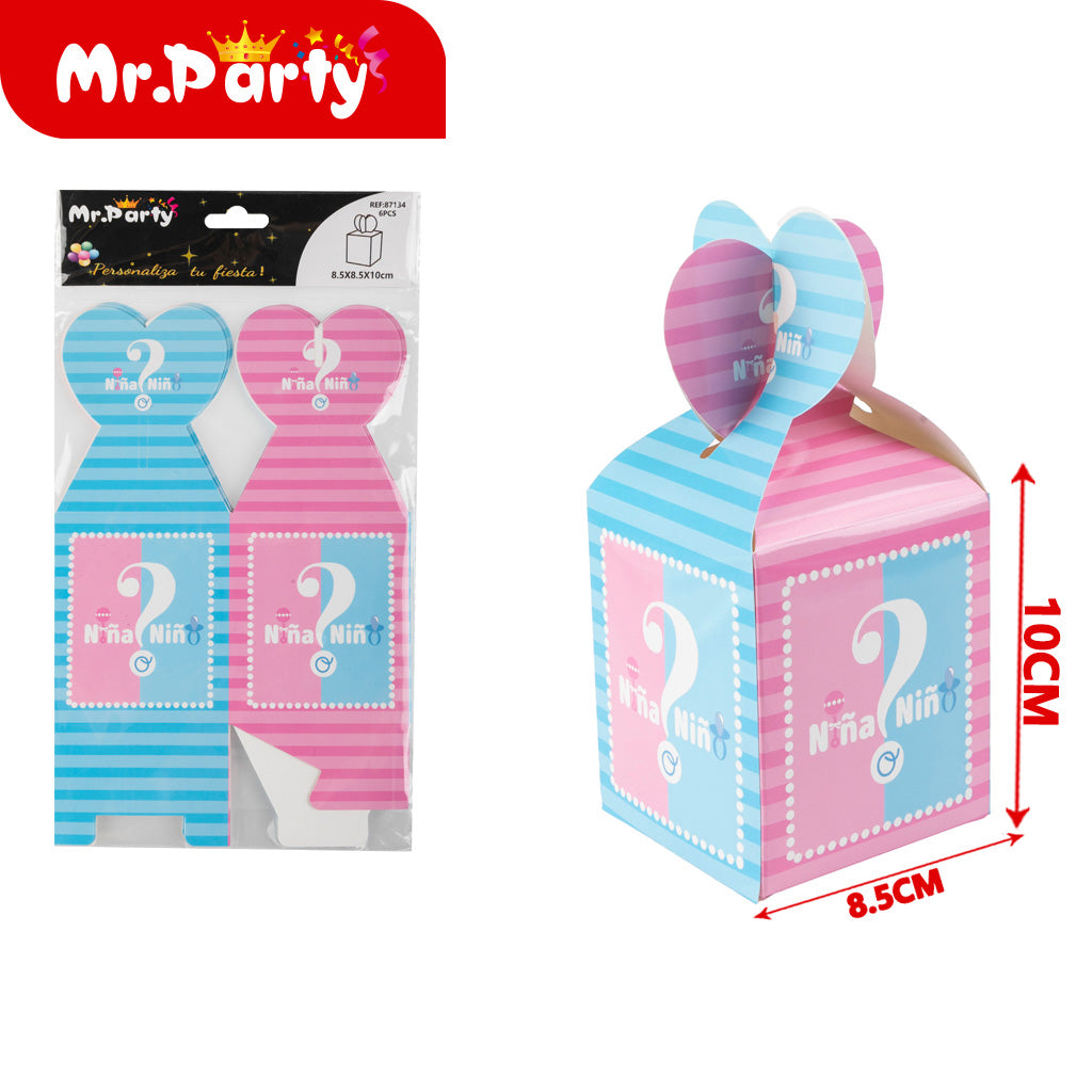 Caja de dulces 6 adivina el género en español. Ideal para complementar la decoración y darle un toque especial al evento. Se venden en paquetes de máximo 12 unidades.