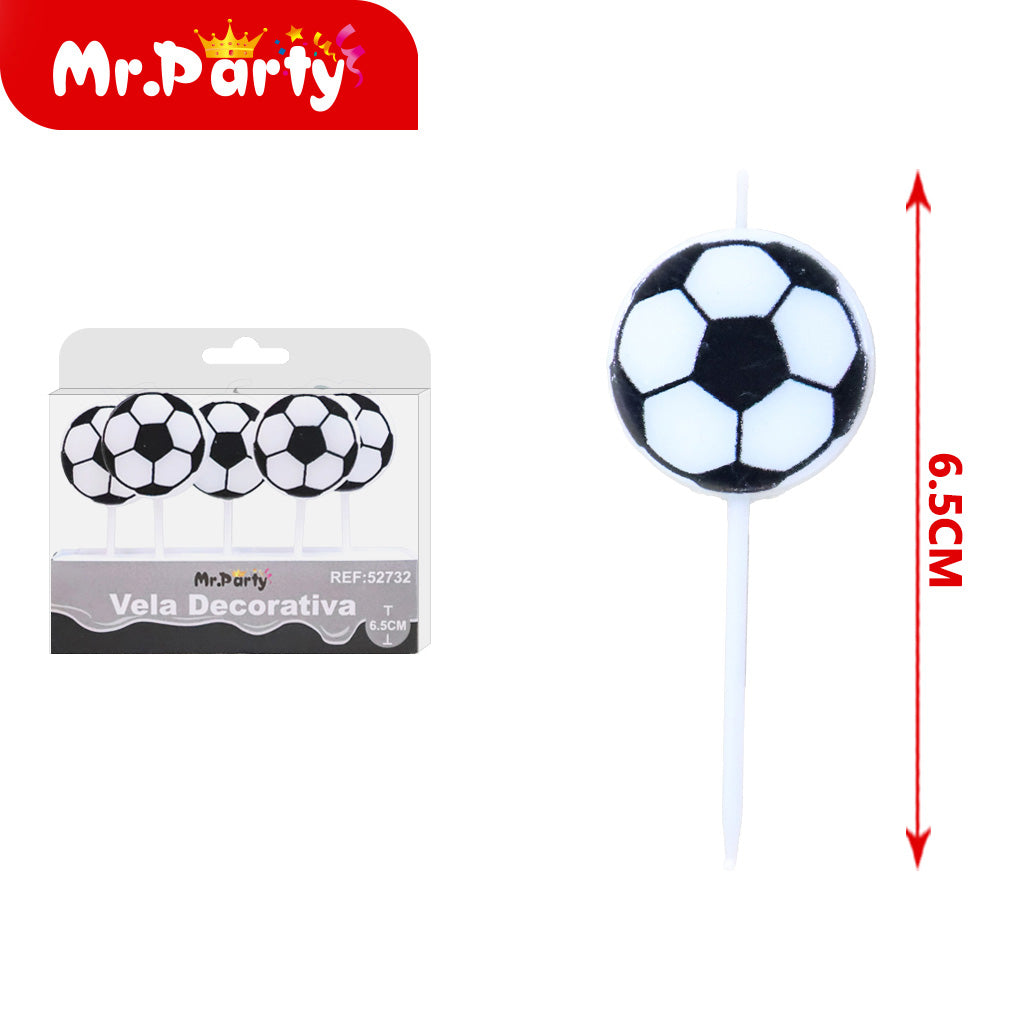 Caja de pvc con 5 velas de fútbol en blanco y negro. Ideal para complementar la decoración y darle un toque especial al evento. Se venden en paquetes de máximo 12 unidades.
