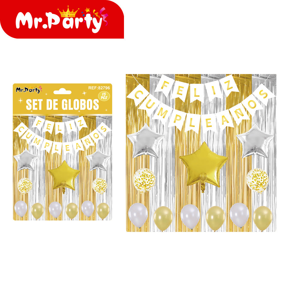 Juego de 15 piezas de seda de lluvia empalmada dorada y plat. Ideal para complementar la decoración y darle un toque especial al evento. Se venden en paquetes de máximo 12 unidades.