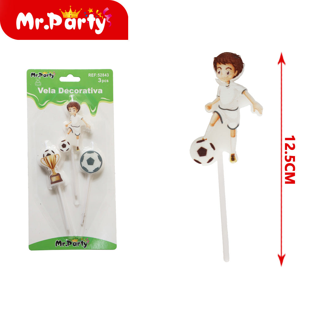 Juego de 3 velas de fútbol. Ideal para complementar la decoración y darle un toque especial al evento. Se venden en paquetes de máximo 12 unidades.