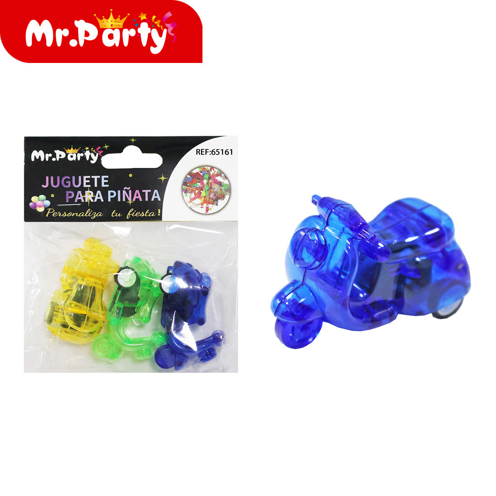 Motocicleta con retroceso. Ideal para complementar la decoración y darle un toque especial al evento. Se venden en paquetes de máximo 12 unidades.