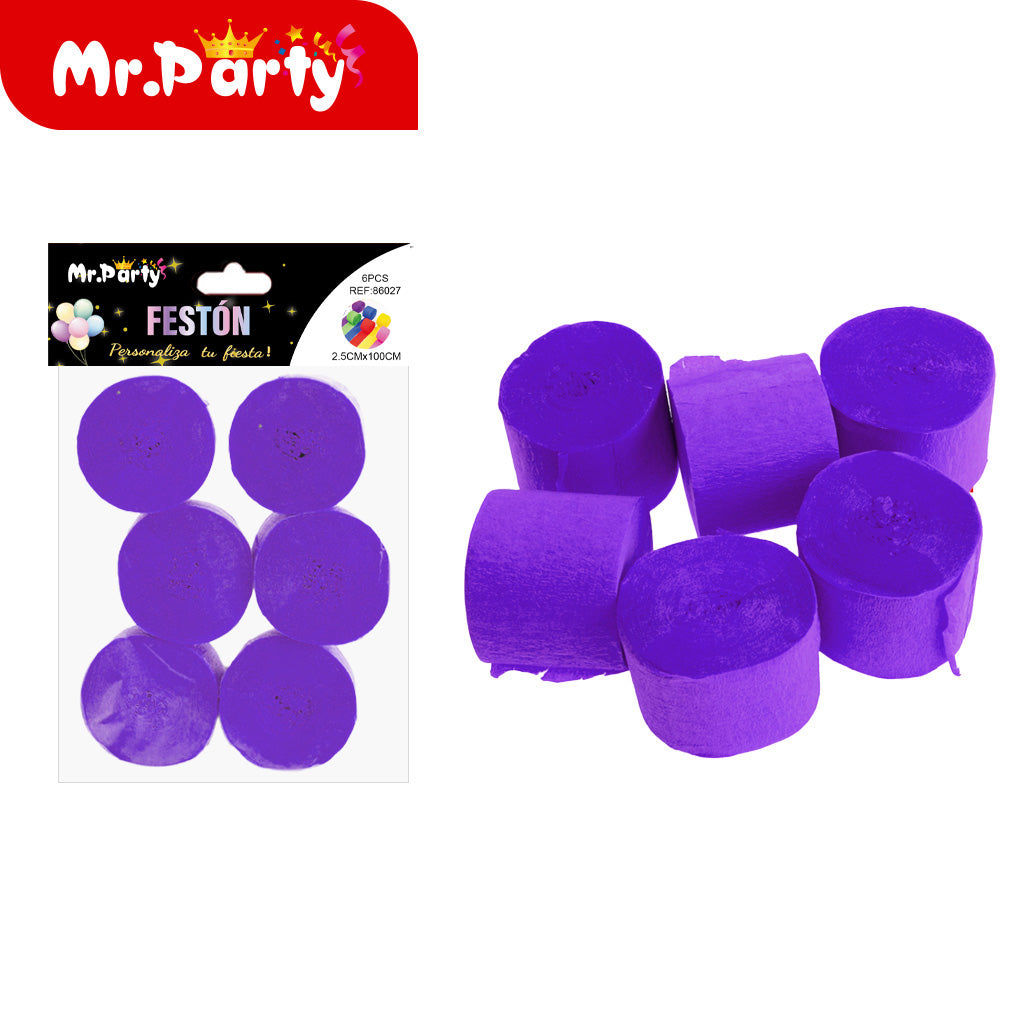 Papel crepé de un solo color 25 cm x 100 cm 6 piezases morad. Ideal para complementar la decoración y darle un toque especial al evento. Se venden en paquetes de máximo 12 unidades.