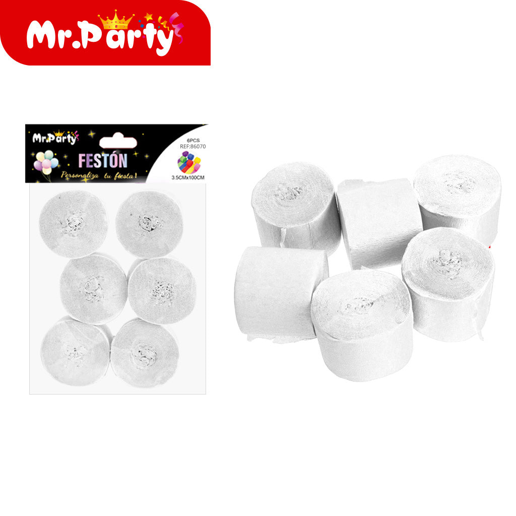 Papel crepé de un solo color 35 cm x 100 cm 6 piezas blanco. Ideal para complementar la decoración y darle un toque especial al evento. Se venden en paquetes de máximo 12 unidades.