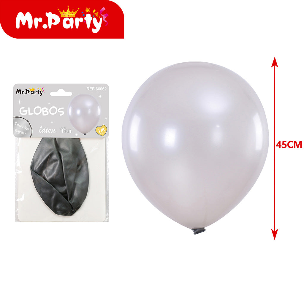 Plata perlada de 18 pulgadas. Ideal para complementar la decoración y darle un toque especial al evento. Se venden en paquetes de máximo 12 unidades.