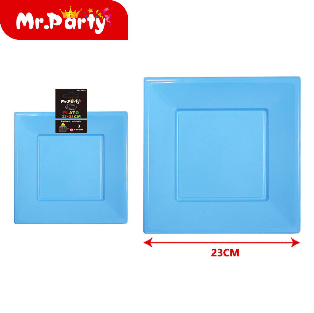 Plato cuadrado de plástico de 23 cm (9") 3 piezas color azul (12paquetes)
