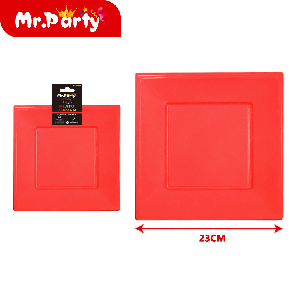Plato cuadrado de plástico de 23 cm (9") 3 piezas color rojo (12paquetes)