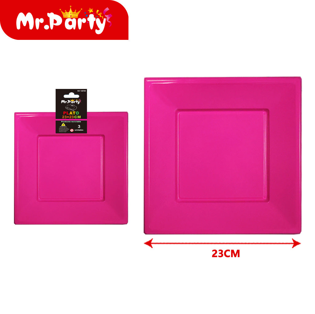 Plato cuadrado de plástico de 23 cm (9") 3 piezas color rojo. Utensilios resistentes y prácticos, ideales para comidas en fiestas y reuniones. Se venden en paquetes de máximo 12 unidades.